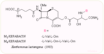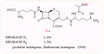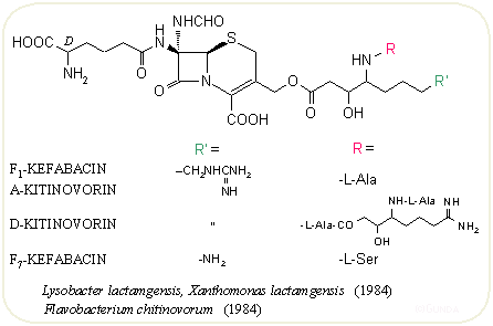 A mikrovilág szereplőinek mind kiterjedtebb tesztelése közben találtak rá a japán Takeda és Shionogi kutatói az érdekes oligopeptid oldalláncú kefabacinokra és a velük részben azonos kitinovorinokra. Mint a nevük is mutatja, ezeket baktériumok termelik, s egy újabb 7α-szubsztituens, a formilamino csoport is megjelenik a molekulák egy részében – ez szintén a β-laktamáz enzimmel szembeni ellenállóképességet növeli. A 6α-formilamino csoport használatával több szintetikus penicillinben és kefalosporinban is próbákoztak. A közel negyven izolált anyag közül alább láthatunk néhány jellemző szerkezetet: