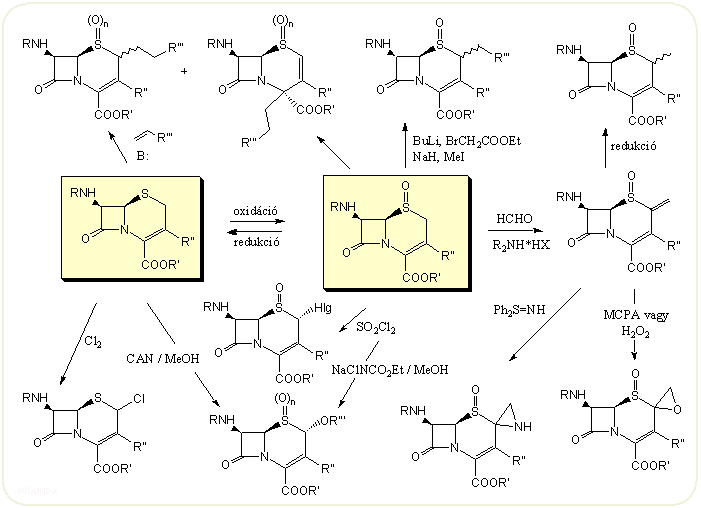 A kefalosporin-szulfoxidok és szulfonok a penicillinekhez hasonlóan, enyhe oxidációval állíthatók elő (H2o2, perecetsav, 4-klór-perbenzoesav, stb.). A szulfoxidok könnyen redukálhatók (pl. PBr3), a szulfonok redukciójára nem ismeretes módszer.
