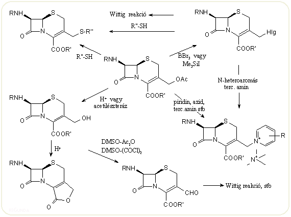 Kémiailag igen jelentősek a 3-as helyzetben végzett változtatások. A természetes kefalosporinokban itt 3-acetoximetil, a kefamicinekben karbamoilmetil vagy más alk(en)iloximetil csoport van, a félszintetikus származékokban igen sok helyettesítést találunk, mivel alkalmas szubsztitúcióval egyrészt az antibakteriális hatás fokozható, másrészt a vegyület farmakokinetikája is igen függ e szerkezeti résztől. A 3-acetoxi csoport S és N nukleofilekkel a szokott módon cserélhető, a nukleofil partner jellegétől függően könnyebben vagy nehezebben. Lehet előzetesen trimetilszilil-jodiddal in situ jodid vagy BBr3-dal bromid származékot képezni és azt reagáltatni. Az acetoxi csoport enzimatikusan, vagy mind savas, mind lúgos körülmények között hidrolizálható, azonban savas közegben, szabad savak esetén igen gyorsan laktonképződés játszódik le.