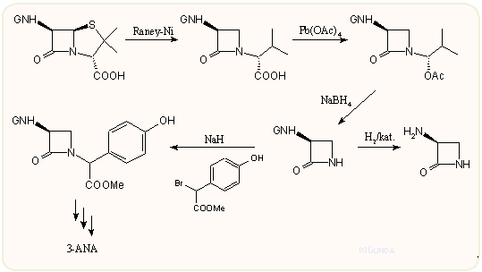 A 3-amino-nokardicinsav előállítására kémiailag egyszerű szerkezete miatt a közvetlen bioszintetikus út mellett egyéb előállításokat is kidolgoztak. Közvetett bioszintetikus útnak tekinthető a penicillinek lebontásával történő előállítás, ezt a Fujisawa cég kutatói dolgozták ki. A penicillin Raney-nikkeles deszulfurizációja után az N-oldalláncot oxidálják, majd karbinolaminná redukálva távolítják el. Ezután a β-laktám NH csoportját bróm-fenil-metilacetáttal reagáltatva, majd a védőcsoportokat eltávolítva a 3-ANA megkapható: