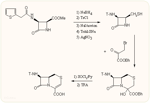 A szintézisükre több változatot is kidolgoztak. Az első példában a kiindulási vegyületet a megfelelő Schiff-bázisból királis Staudinger reakcióval állítják elő. Az 1-es és 4-es helyzetben megfelelő észtereket kialakítva a gyűrűzárást Dieckmann kondenzációval hajtják végre. A keletkezett 3-keto-kefam gyakorlatilag teljesen enol formátumú és könnyen a 3-klór származékká alakítható, majd szokásos védőcsoport cserékkel a kívánt végtermékké alakítható.