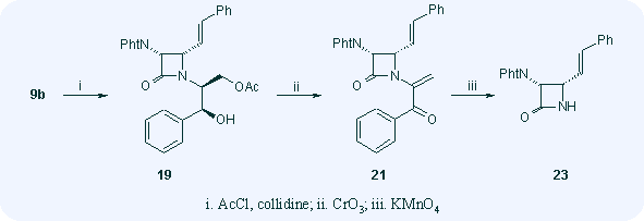 Abstract: 3,4-cis-1-N-(1'-phenyl-1',3'-dihydroxy-2'-propyl)-3-phthalimido-4-styrylazetidinones were obtained in optically pure form by chiral Staudinger reaction. The cis-α/β-ratio could be influenced by the protective groups of the diol moiety. Removal of the chiral auxiliarity could be accomplished by direct oxidation, or by previous double bond formation, thus the 2-amino-1-phenyl-propan-1,3-diol can be regarded to a generally useful chiral auxiliary.