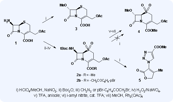 Abstract: The 7β-amino-cephalosporin sulphones, generated in situ from the appropriate 7β-tBoc-amino derivative and diazotized in a one-pot reaction in aq. HClO4 - MeOH - NaNO2, rearrange exclusively to the triazoles 5 in a multistep reaction.